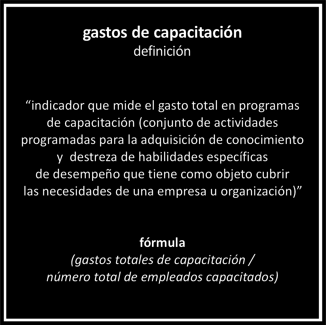 Indicador que mide el gasto total en programas de capacitación (conjunto de actividades programadas para la adquisición de conocimiento y destreza de habilidades específicas de desempeño que tiene como objeto cubrir las necesidades de una empresa u organización)